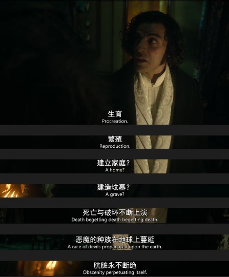 德尔·托罗从小就是玛丽·雪莱原著的粉丝,一直想拍一版属于自己的《弗兰肯斯坦》。我不确定这是不是最好看的,但是最打动我的一部。它重释经典,小说开创性的哥特-科幻风格在视听上得到华丽凄美、震撼人心的呈现,继续探讨关涉人类存在的根本问题,“我是谁”、“何以为人”、“何为生死”、“如何活”,并且在原著引人深思、充满现代性悲剧的结局基础上向前迈了一步,不仅使“造物”(The Creature)直接讲述自己的故事,也给了他和维克多·弗兰肯斯坦通过对话获得理解的机会,在悲剧性中注入一束基于人与人之间关系和情感而存在的救赎光芒。