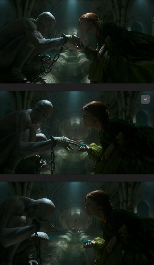 德尔·托罗没有设计具体的情节来实现两人关系的转化,而是把变化藏在叙事里,在我看来是很有效的方法。只不过对观看的注意力有一定要求,因为如果忽视了这些蕴藏于叙述中的细节,就很难感受到人物认知和情感的转变,那么他的行为变化就显得突兀,缺乏根基。
