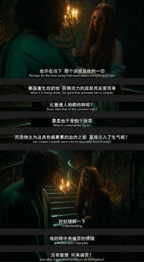 维克多由母亲保护的善良、被父亲压抑的愤怒、挑战权威(死亡)的执念与傲慢、达成目标后因未思考过意义而感到的虚空、因过分以自我为中心而对他人(尤其是“造物”)缺乏耐心、因缺乏耐心而释放暴虐、因善念残存而被激发出怜悯之心,所有这些复杂的情感和省思,都在他的叙述中浮现,是他最终能够听懂“造物”的讲述、真心感到抱歉的基础