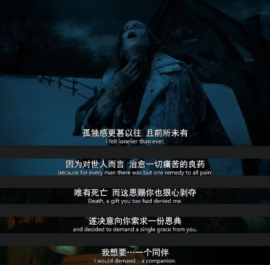 在失去老者的陪伴后,“造物”发现自己的孤独难以化解,他找到维克多,希望他再造一个同类,互相陪伴。