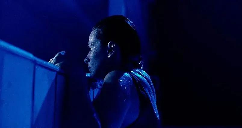 影片中对蓝的运用体现在光学与光线;人物造型设计(道具-装饰灯的蓝石头和蓝色碎花墙壁等);环境造型设计(数次出现的室内泳池);也在音乐设计上。